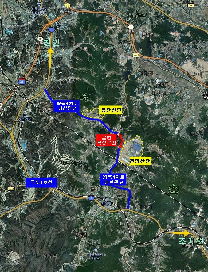 전의·첨단산단 진입도로는 전의산단과 첨단산단이 위치한 소정면 대곡리와 전의면 동교리 사이 9.1㎞를 잇는 사업으로, 시는 지난 2007년 개설·확장 공사에 착수해 지난해 8월 개통했다.