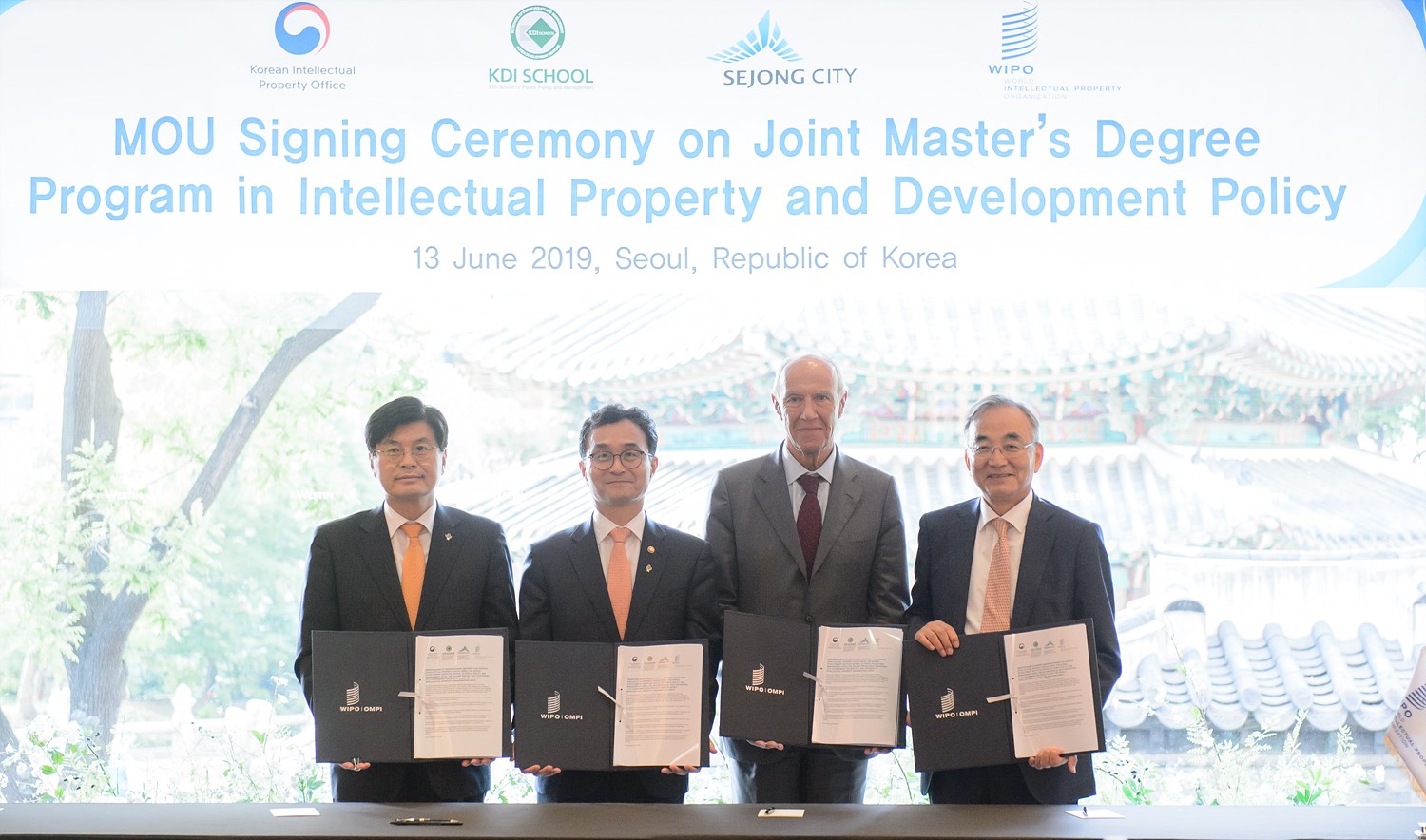 시는 13일 서울 웨스턴조선호텔에서 이춘희 시장과 박원주 특허청장, 최정표 KDI국제정책대학원 총장, 프란시스 귀리 세계지식재산기구(WIPO) 사무총장이 참석한 가운데 ‘지식재산 개발정책 석사과정 개설을 위한 협약’을 체결했다고 밝혔다.