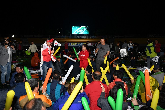 16일 자정부터 예산종합운동장 주경기장에서 열린 ‘이광연 선수 거리응원’에 황선봉 예산군수를 비롯한 이광연 선수의 할머니와 부모님, 군민, 군청직원 등 2000여 명의 함성과 환호가 가득 찼다.