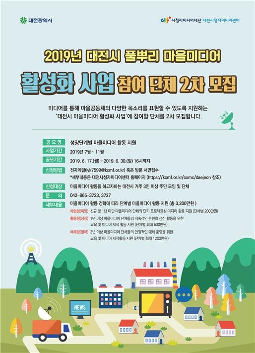 대전시와 시청자미디어재단 대전시청자미디어센터는 오는 30일까지‘2019년 대전시 풀뿌리 마을미디어 활성화 사업’하반기 참여 단체를 모집한다.