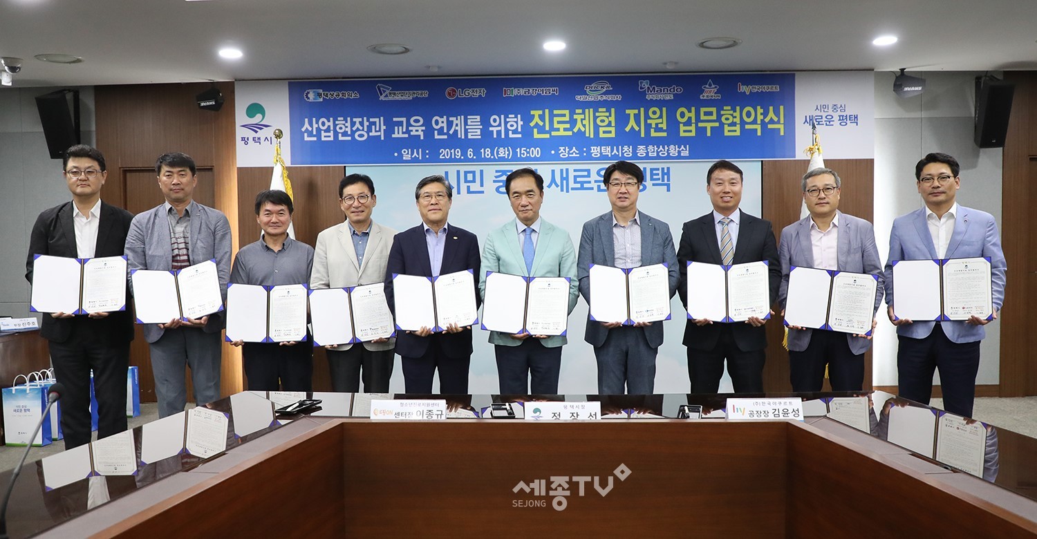 평택시(시장 정장선)는 지난 18일 시청 종합상황실에서 평택상공회의소, 평택산업단지관리공단, 관내 기업체, 평택시청소년진로지원센터 드림온 관계자 등 20여명이 참석한 가운데 관내 체험처 8개소와 평택시 진로교육 발전을 위한 공동의 업무협약을 체결했다.