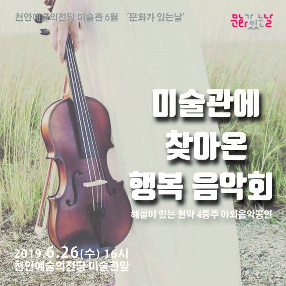 이번 6월 문화가 있는 날 프로그램은 미술관 특별전 ‘행복을 그리는 화가 에바 알머슨 인 천안’과 연계해 ‘음악으로 즐기는 행복’을 주제로 음악회가 진행된다.