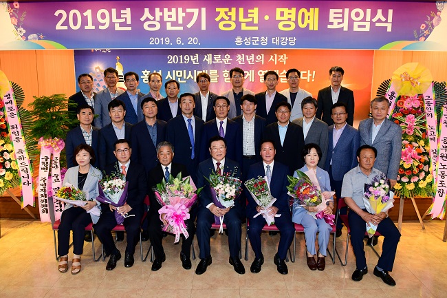 2019년 상반기 정년퇴직자는 이청영 (전)지역개발국장, 이승우 (전)행정복지국장, 임재훈 홍성읍 개발과장, 원호영 대율보건진료소장, 김성진 주사, 전재구 주사이며 명예퇴직자는 한진곤 구항면장, 송은숙 인재양성팀장이다.