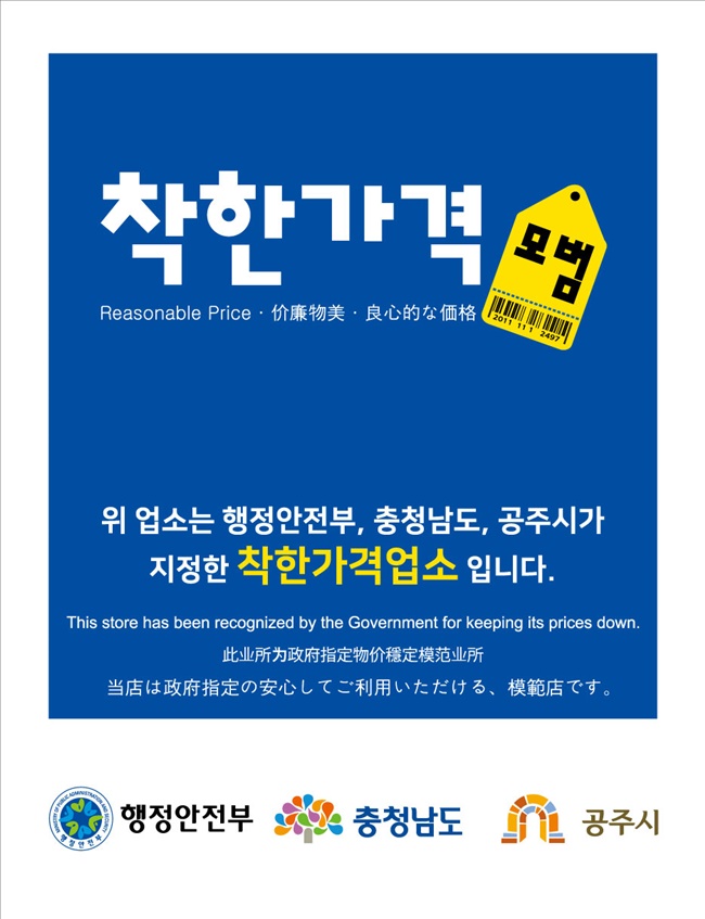 공주시(시장 김정섭)가 물가안정 모범업소인 ‘착한가격 업소’를 신규 모집한다.
