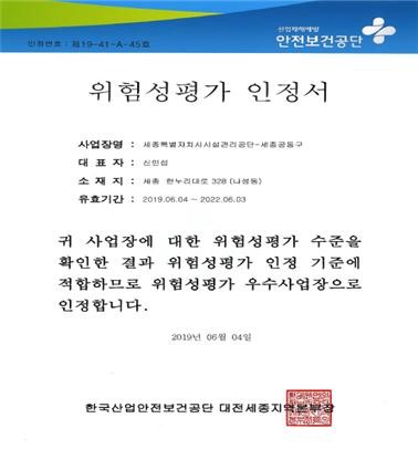 세종특별자치시시설관리공단(이사장 신인섭, 이하 ‘공단’)에서 관리하는 세종공동구가 한국산업안전보건공단으로부터 ‘위험성평가 우수사업장 인정’을 받았다고 지난 24일 밝혔다.