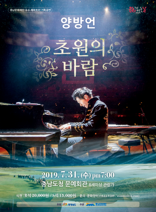 7월 충남도청 문예회관 우수 레퍼토리 기획공연 <양방언, 초원의 바람>은 다큐멘터리 <아리랑 로드>, <차마고도> 및 2018 평창 동계올림픽 개폐회식 음악감독을 역임한 양방언의 피아노를 중심으로 베이스, 기타, 퍼커션 등 국내외 정상급 연주자들의 연주를 함께 들을 수 있다. 또한 중국 민속악기 ‘얼후’가 편성되어, 평소 쉽게 접할 수 없었던 그의 음악을 한 자리에서 만날 수 있는 기회가 될 것이다.