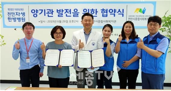 천안시종합사회복지관(관장 문명희)은 6월 26일(수) 천안시 서북구 불당로 소재 천안자생한방병원(병원장 문자영)과 지역주민의 건강증진을 위한 업무협약을 체결했다.