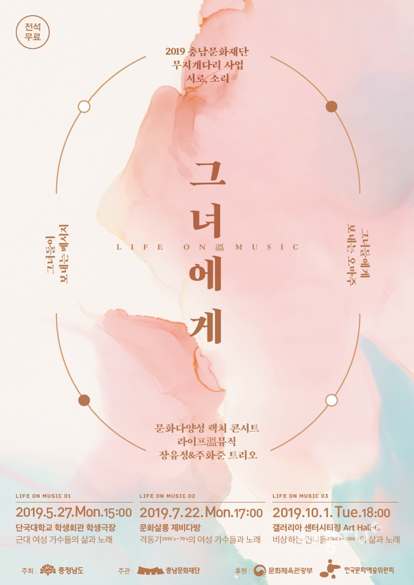 한편 2019 무지개다리 사업 ‘서로, 소리’의 문화다양성 가치 인식 및 확산 프로그램의 일환으로 진행되는 <Life 溫 Music ; 그녀에게>는 현대사에서 그림자로 사라진 여성들의 이야기를 당대 대중음악과 함께 풀어가는 렉처 콘서트(강의+공연)다. 올해 총 3회로 진행될 예정이며, 재즈로 편곡된 세련된 라이브 연주를 알찬 강의와 함께 즐길 수 있도록 기획되었다.