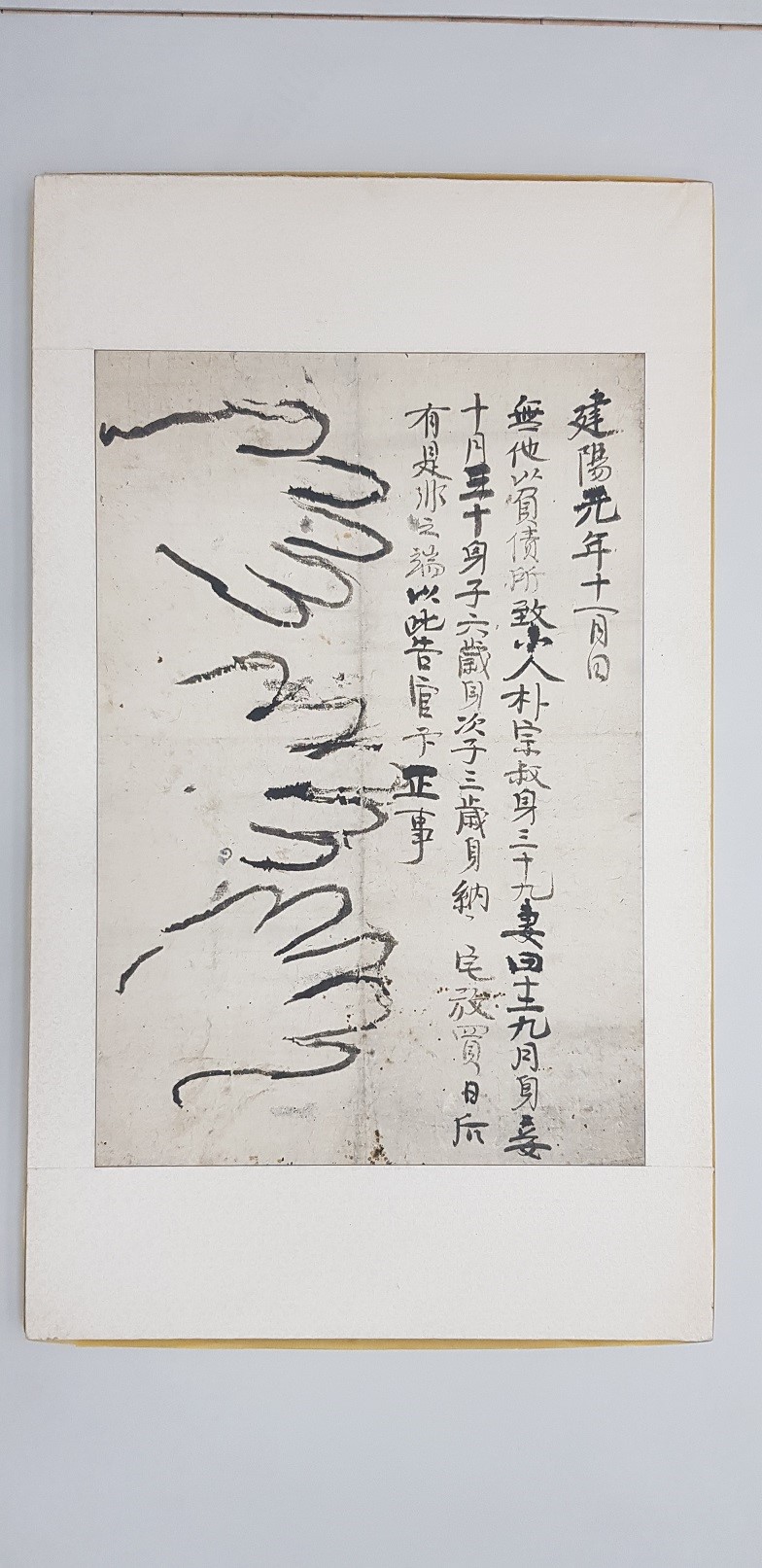 전시되는 자매문기(自賣文記)는 1896년(高宗 33) 박종숙(朴宗叔)이 자신을 비롯해 부인과 첩 그리고 두 아들을 노비로 팔고자 작성한 문서다.