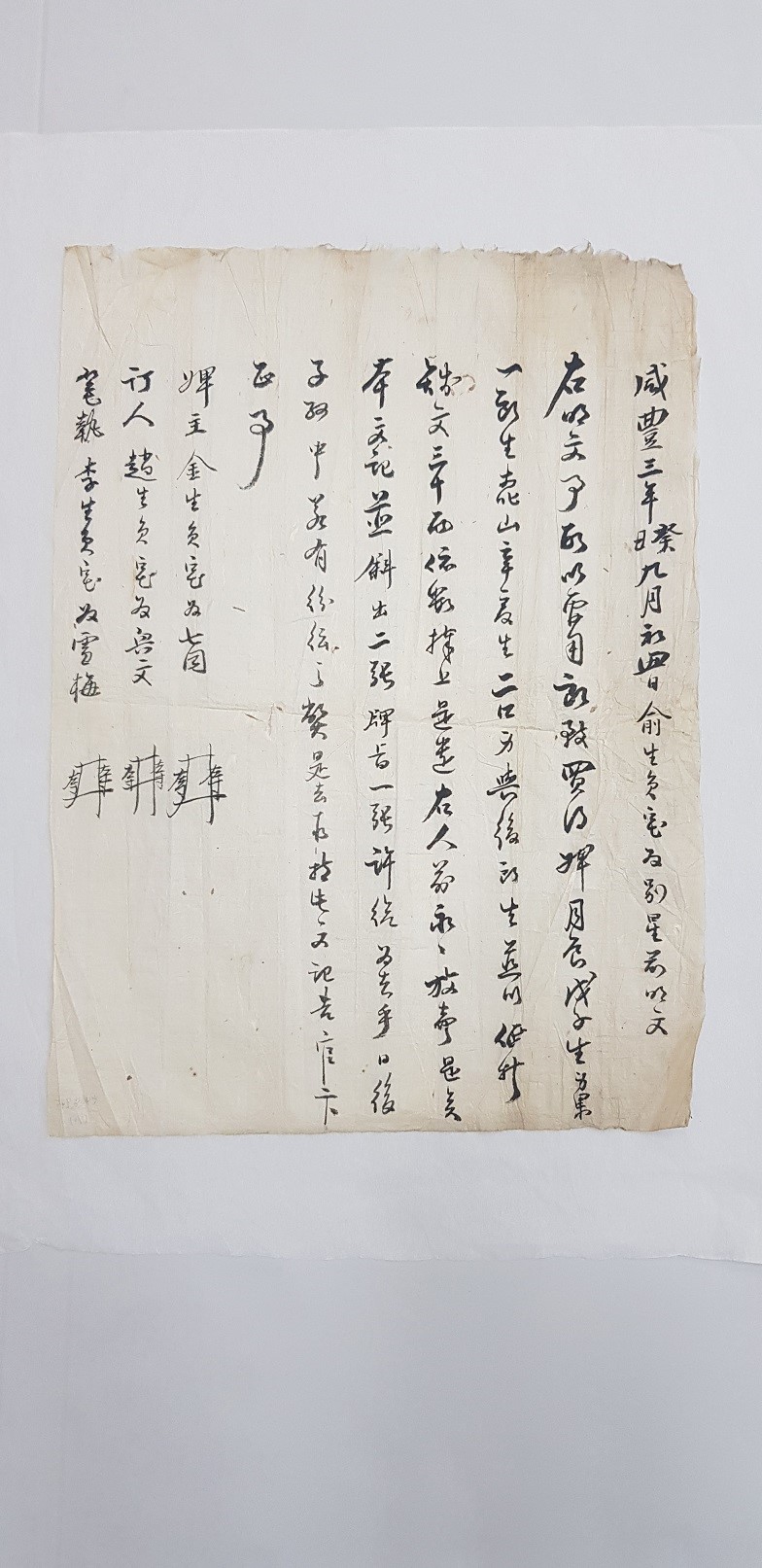 전시되는 노비매매문기(奴婢賣買文記)는 1853년(哲宗 4) 김생원(金 生員)댁에서 유생원(兪生員)댁에 비(婢) 월량(月良)과 그 자녀를 30냥에 판다는 내용의 매매 문서다.