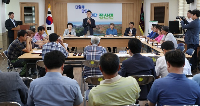 양승조지사는지난 6일 청양 정산면사무소 회의실에서 주민과 간담회에서“주민 여러분께 심려를 끼쳐드려 죄송하다”고 말했다.