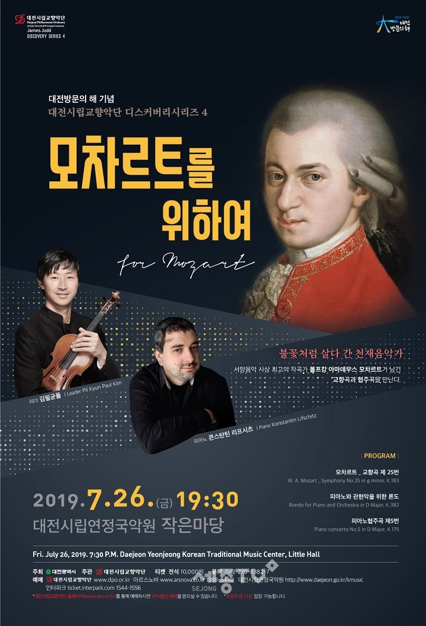 세계적인 피아니스트 콘스탄틴 리프시츠와 대전시향이 자랑하는 악장 김필균폴의 리드, 그리고 대전시립교향악단이 함께 빚어낼 모차르트가 많은 애호가들의 이목을 끌고 있으며, 벌써부터 예매행렬이 이어지고 있다.