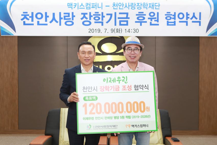 맥키스 컴퍼니(회장 조웅래)와 천안사랑장학재단(이사장 구본영)이 9일 시청 소회의실에서 장학기금 후원을 위한 업무 협약을 체결했다.