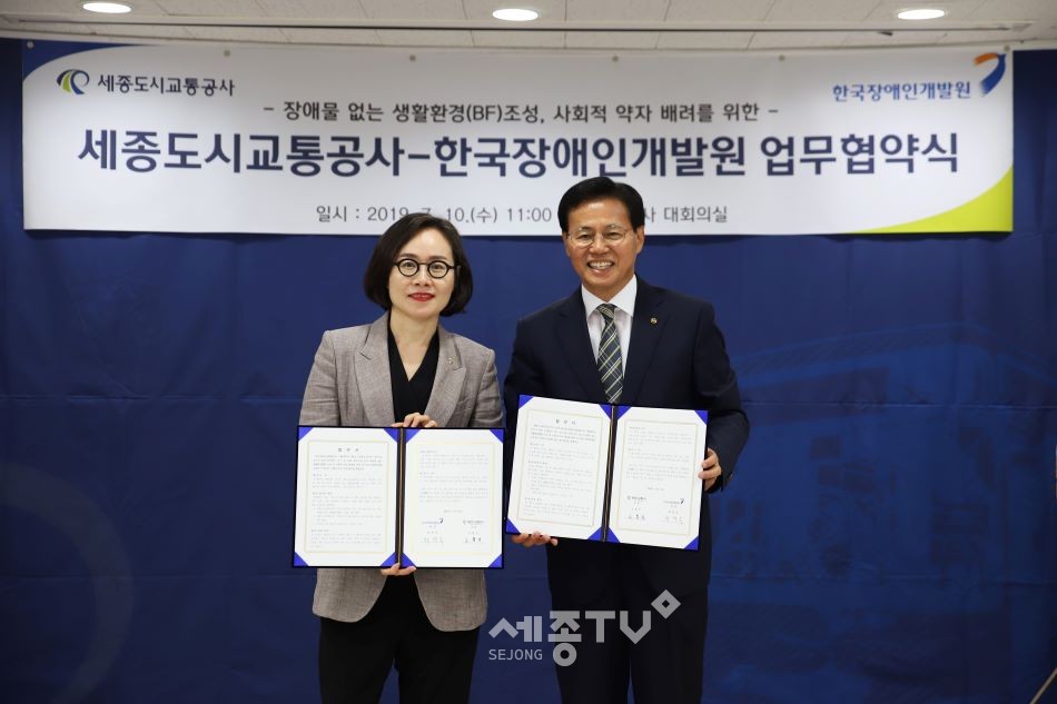 세종도시교통공사(사장 고칠진)는 한국장애인개발원(원장 최경숙)과 교통약자를 위한 장애물 없는 대중교통 생활환경(BF)을 조성하는데 뜻을 같이하고 상호 협력을 위한 업무협약을 10일 체결했다고 밝혔다.