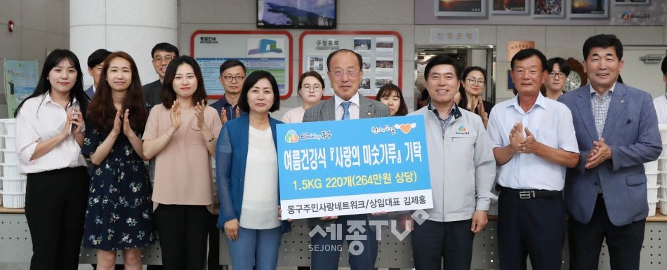 대전 동구(구청장 황인호)는 10일 구청 1층 로비에서 동구 주민사랑네트워크(상임대표 김제홍)의 천사의 손길 ‘사랑의 미숫가루’ 기탁식을 개최했다고 밝혔다. 이날 김제홍 대표는 독거어르신, 노숙인센터 등 지역 내 어려운 이웃들에게 배부해 달라며 264만 원 상당의 1.5kg 미숫가루 220개를 기탁했다.