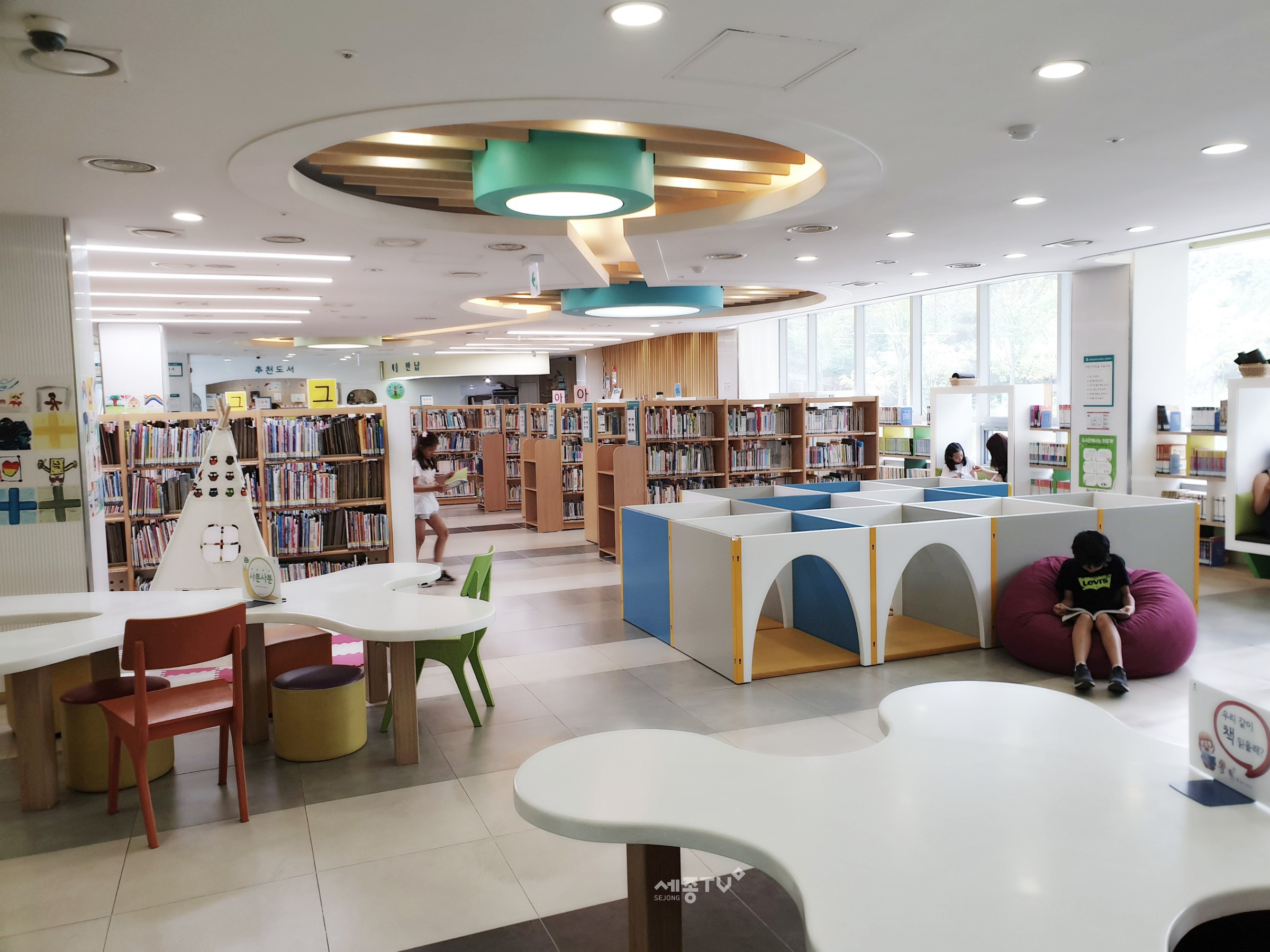 서가에 꽉찬 장서, 넓은 자리를 차지했던 등받이 소파 대신 어린이들의 상상력과 흥미를 자극하는 어린이캐럴공간과 영어특화 서가로 재탄생하게 됐다. 서가측면을 활용한 전시공간은 어린이들의 호기심을 유발하여 아름다운 그림책의 세계로 이끌고 있다.