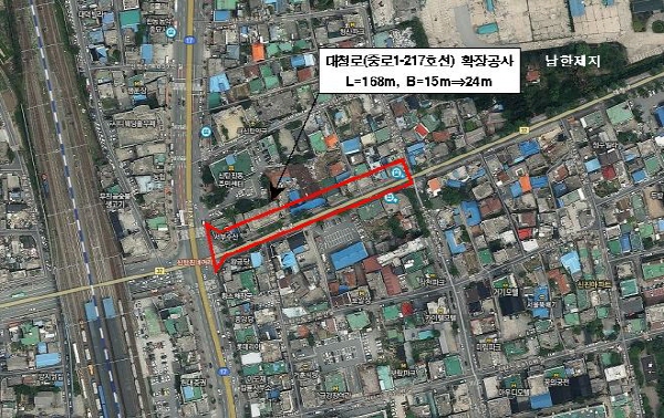 이에 따라 이번에 추진되는 사업은 대청로(중로1-217호선)확장공사(B=15m⇒24m, L=168m)로 지난 6월 15일 실시계획인가를 완료하고 올 9월까지 보상협의를 거쳐 오는 2013년 12월까지 공사를 완료할 예정이다.