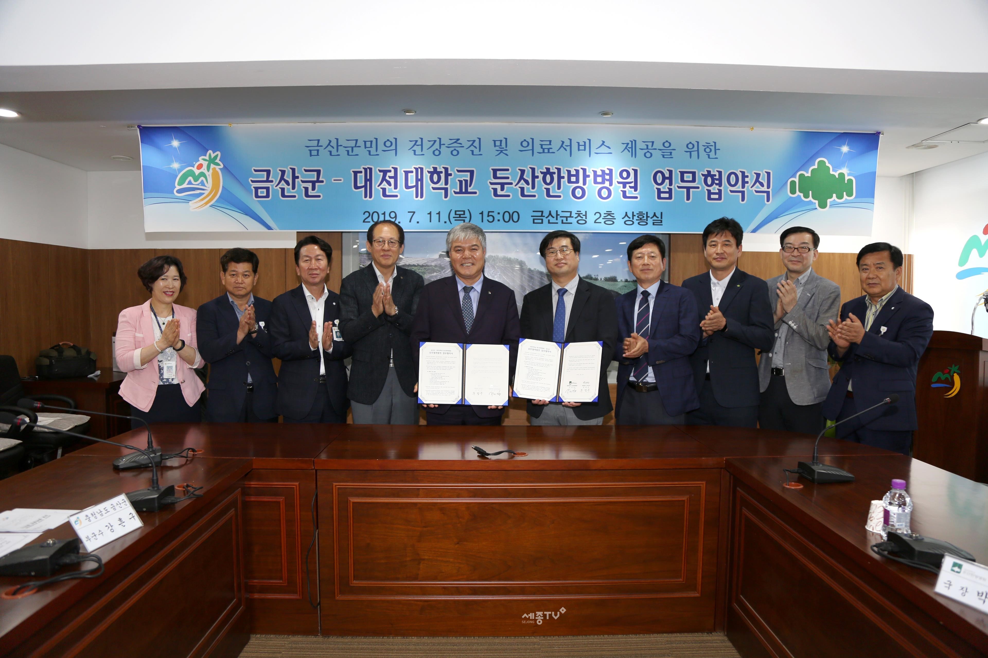금산군은 지난 11일 오후 금산군청 상황실에서 대전대학교 둔산한방병원(병원장 김영일)과 ‘군민 건강증진을 위한 상호 협력발전 업무 협약’을 체결했다.