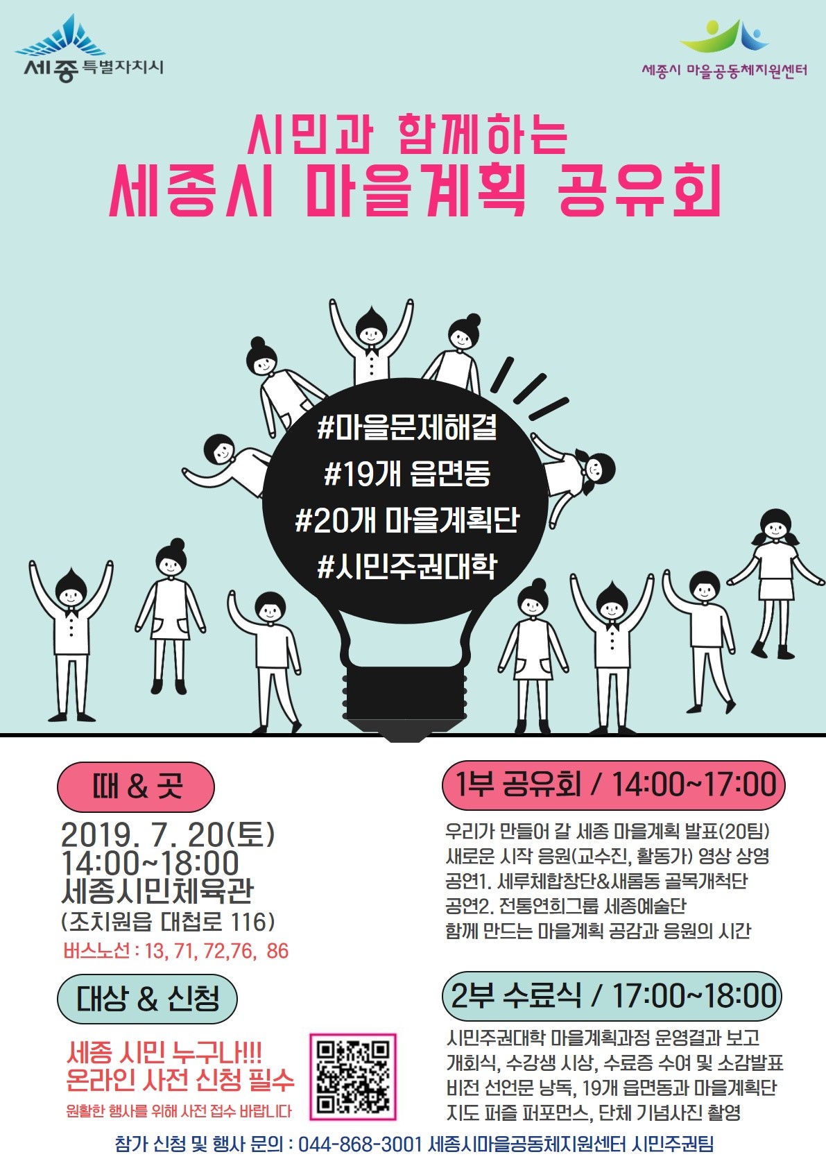 한편, 이번 시민과 함께하는 세종시 마을계획 공유회는 관심 있는 시민은 누구나 참여할 수 있으며 사전신청 또는 자세한 문의는 세종시마을공동체지원센터(☎ 044-868-3001, 시민주권팀)으로 하면 된다.