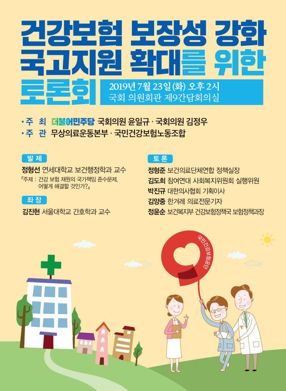 본 행사는 무상의료운동본부, 국민건강보험노동조합이 공동주관하며, 윤일규 의원과 김정우 의원의 인사말을 시작으로 주제 발표 후 패널 토론이 이어진다. 주제발표는 연세대학교 보건행정학과 정형선 교수가 <건강보험 재원의 국가책임 준수문제, 어떻게 해결할 것 인가?>에 대해서 발표한다. 이어 패널 토론에서 보건의료단체연합 정형준 정책실장, 참여연대 사회복지위원회 김도희 실행위원, 대한의사협회 박진규 기획이사, 한겨레 의료전문 김양중 기자, 보건복지부 건강보험정책국 보험정책과 정윤순 과장이 참여하여 열띤 토론을 이어갈 예정이다.