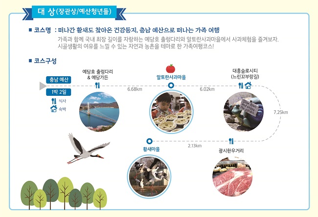 해당 코스는 가족과 함께 국내 최장 길이의 예당호 출렁다리를 둘러보고, 알토란사과마을에서 사과 설기떡 체험을 즐기며, 슬로시티에서 시골생활의 여유로움을 느껴볼 수 있도록 구성했다는 설명이다.