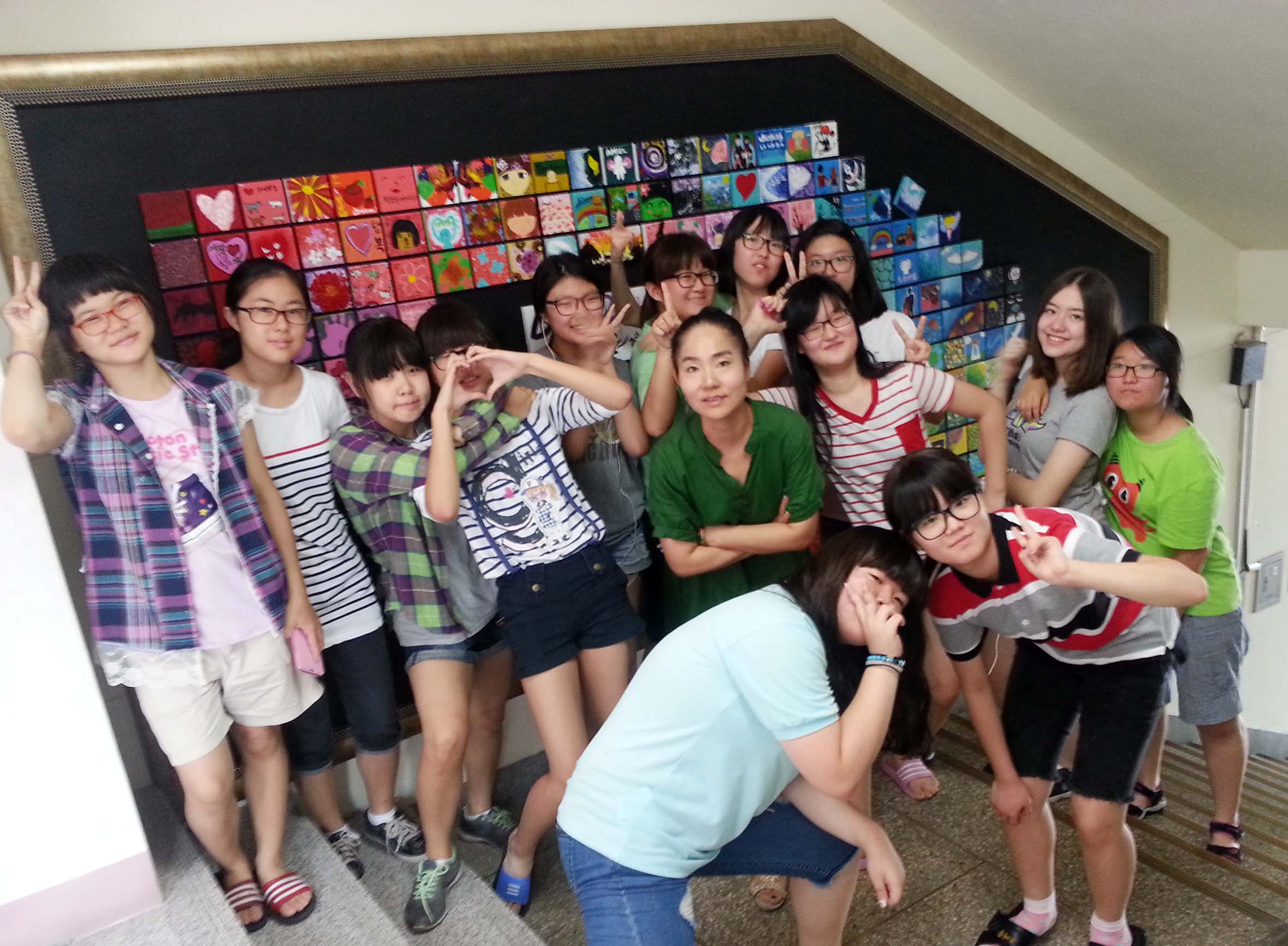 여름방학 무더위 속에서도 송글송글 땀방울을 흘리며 학생들뿐만 아니라 교장, 교사, 학교경비아저씨, 학부모 등 교육공동체가 함께한 대형벽화는 2층으로 오르는 계단벽 양쪽에 4.3미터×1.7미터 크기로 설치됐다.