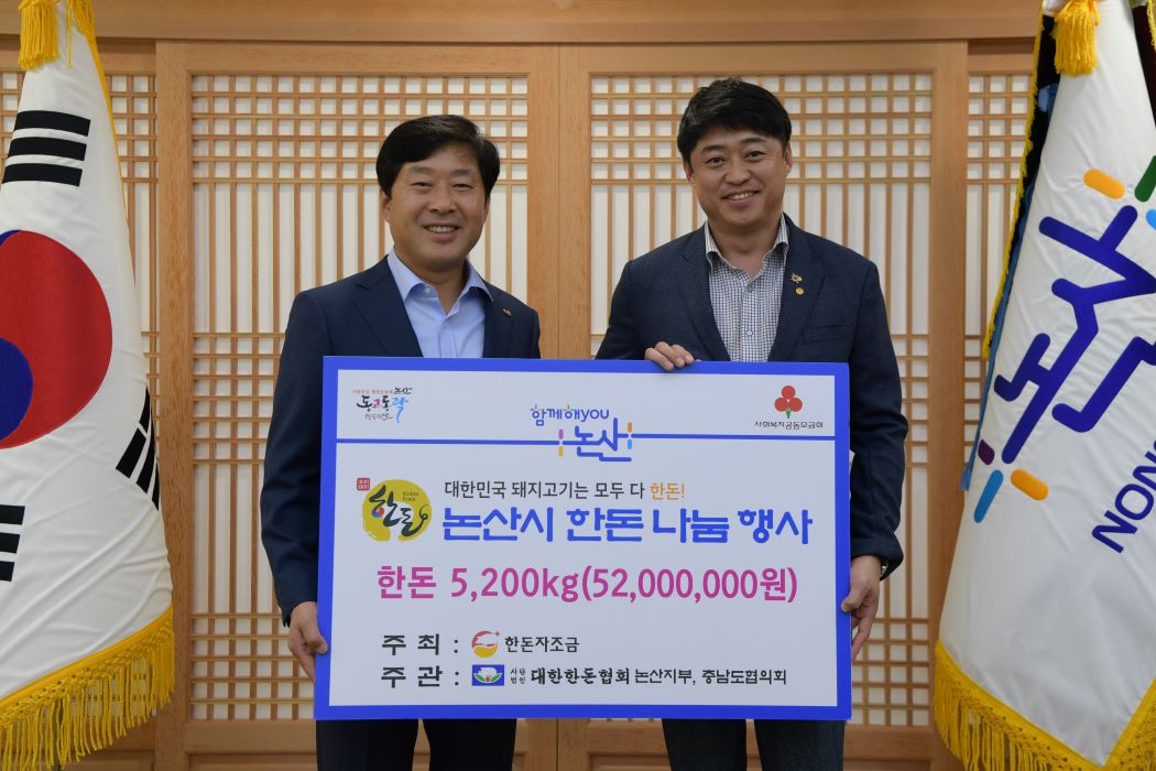 (사)대한한돈협회 논산시지부(지부장 조상덕)는 22일 시청에 방문해 돼지고기 5,200kg(5200만원 상당)을 기탁했다.