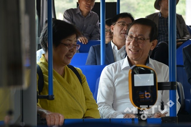 ▲ 손권배 공주시부시장이 지난 5월 공산성부터 석장리 구석기 축제장까지 시민들과 함께 '세종-공주 시티투어'로 이동하고 있는 모습.(사진=김은지 기자)