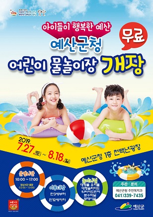 예산군은 여름방학을 맞아 오는 27일부터 다음달 18일까지 총 23일간 예산군청 천백년 광장에서 어린이 물놀이장을 운영한다.