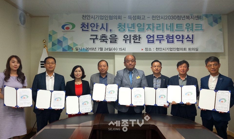 천안시2030청년복지센터(센터장 최진근)와 천안시기업인협의회, 6개 특성화고등학교가 24일 오후 기업인협의회 회의실에서 청년 일자리 네크워크 구축을 위한 업무 협약을 체결했다.