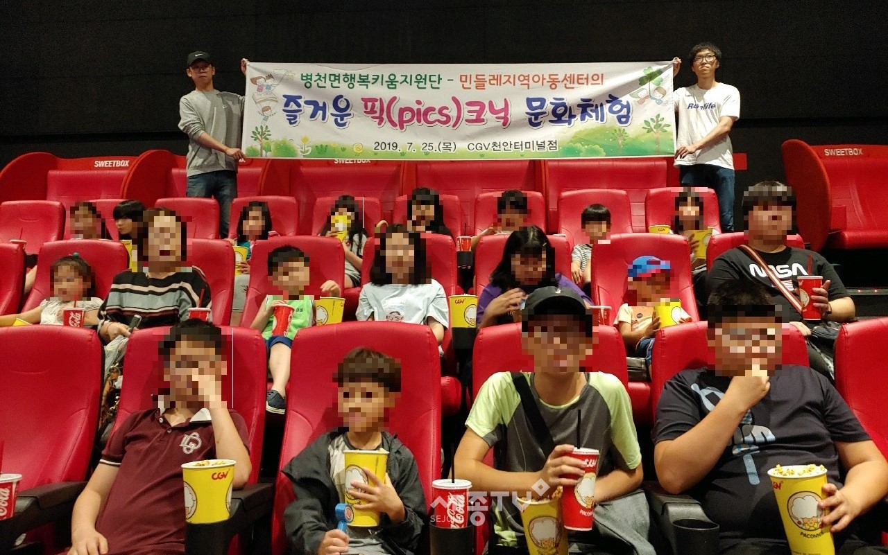 이날 행사는 천안시 복지재단 지정기탁사업비로 마련됐으며, 병천면 맞춤형복지팀과 행복키움지원단은 관내 지역아동센터 아동 27명과 인솔교사 4명이 참여한 가운데 CGV 천안터미널점에서 영화관람 행사를 진행했다.