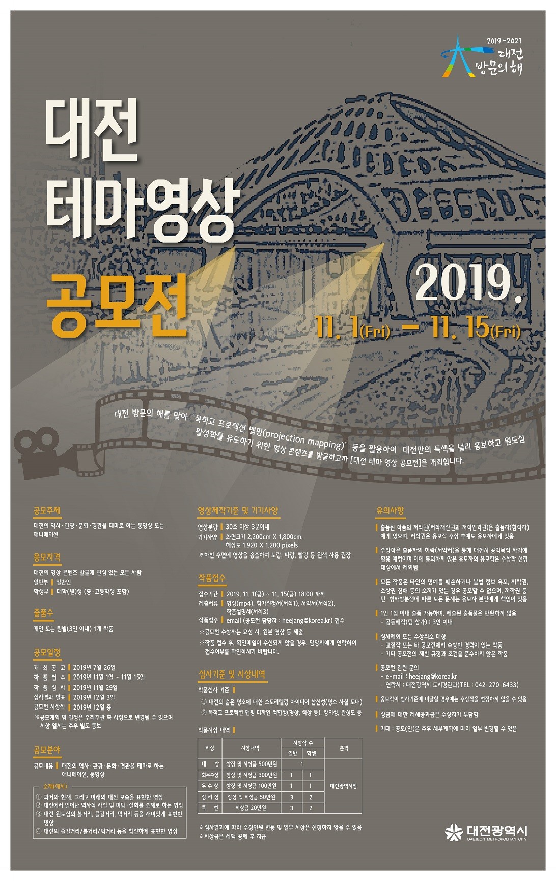 공모분야는 대전의 역사, 관광, 문화, 경관을 테마로 하는 3분이내의 동영상 또는 애니메이션으로, 대전천 등 수면에 영상을 표출하는 프로젝션 맵핑을 활용하는 만큼 노랑, 파랑, 빨강 등 원색을 사용하는 것이 좋다.