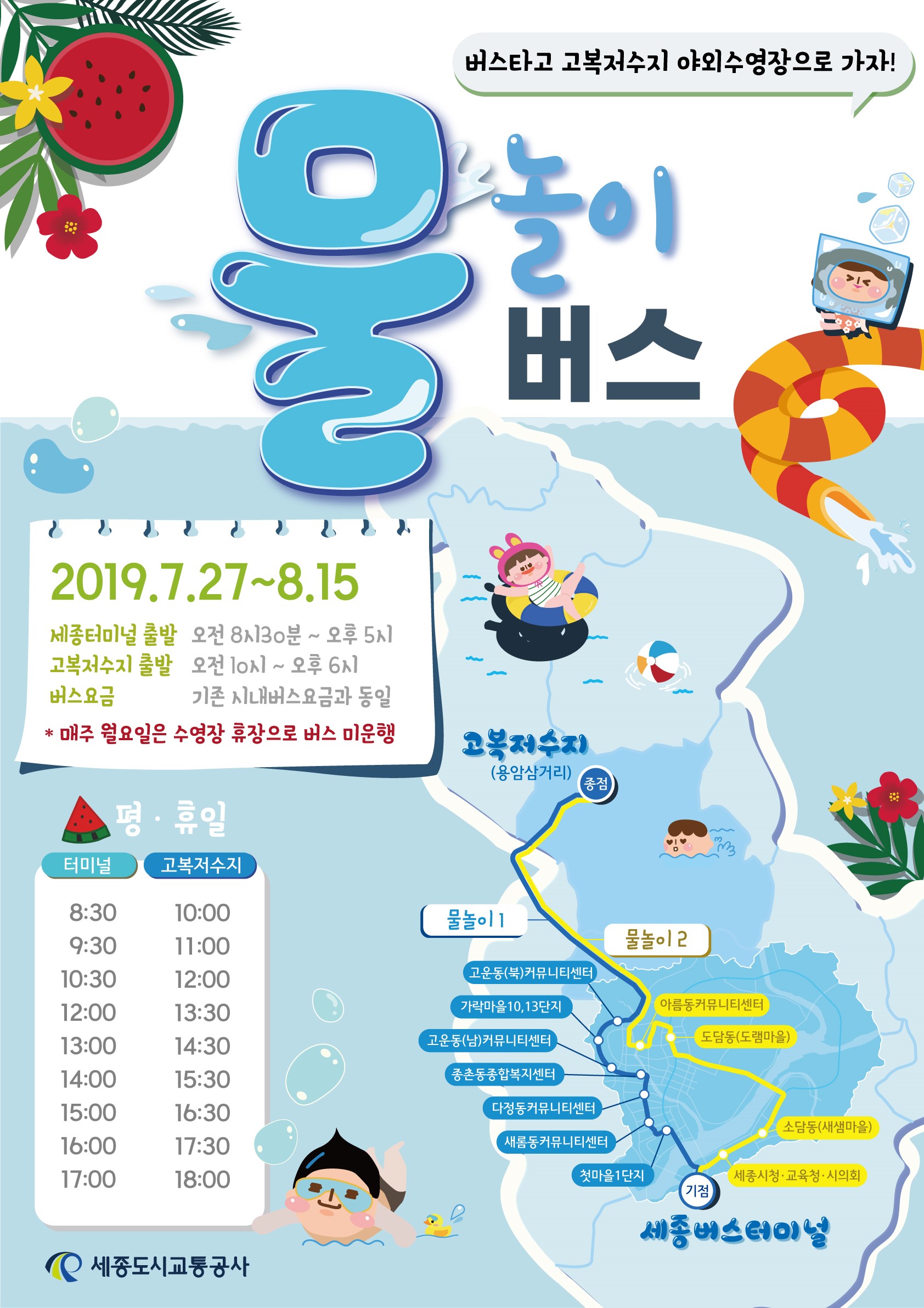 2개 물놀이 버스는 평일과 주말 모두 세종버스터미널(출발)에서 오전 8시 30분부터 오후 5시까지 운행되며, 고복저수지(출발)에서는 오전 10시부터 오후 6시까지 매 1시간 간격으로 일 18회 운영된다.