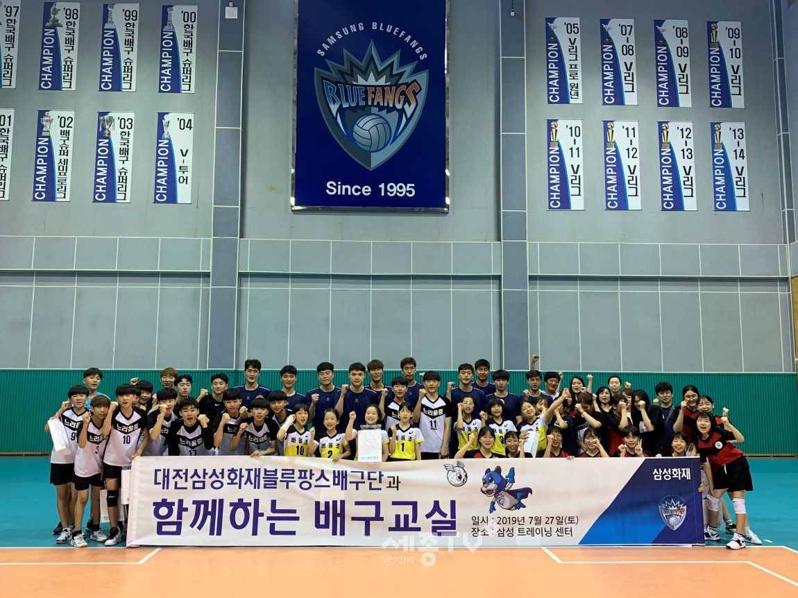 대전서부교육지원청(교육장 이해용)은 7월 27일(토) 경기도 용인의 삼성트레이닝센터에서 대전배울초등학교, 대전느리울중학교 배구스포츠클럽학생이 참여하는 『대전삼성블루팡스와 함께하는 배구교실』 행사를 진행했다고 밝혔다.