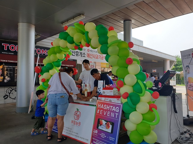 예산사과융복합활성화사업단은 대전-당진 간 고속도로 예산휴게소(대전방향, 소장 조기호)에서 예산군 홍보관 개장 및 판매장 입점기념 예산사과 특산물 판촉행사를 진행 중이다.