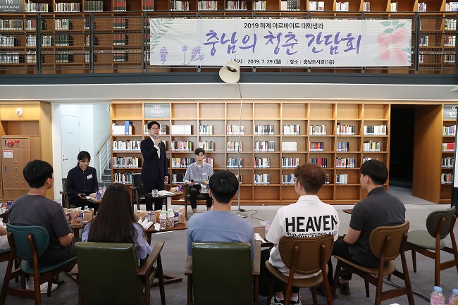도는 29일 충남도서관에서 도지사와 도청 및 직속기관·사업소 등의 하계 아르바이트 대학생이 함께하는 충남의 청춘 간담회를 개최했다.