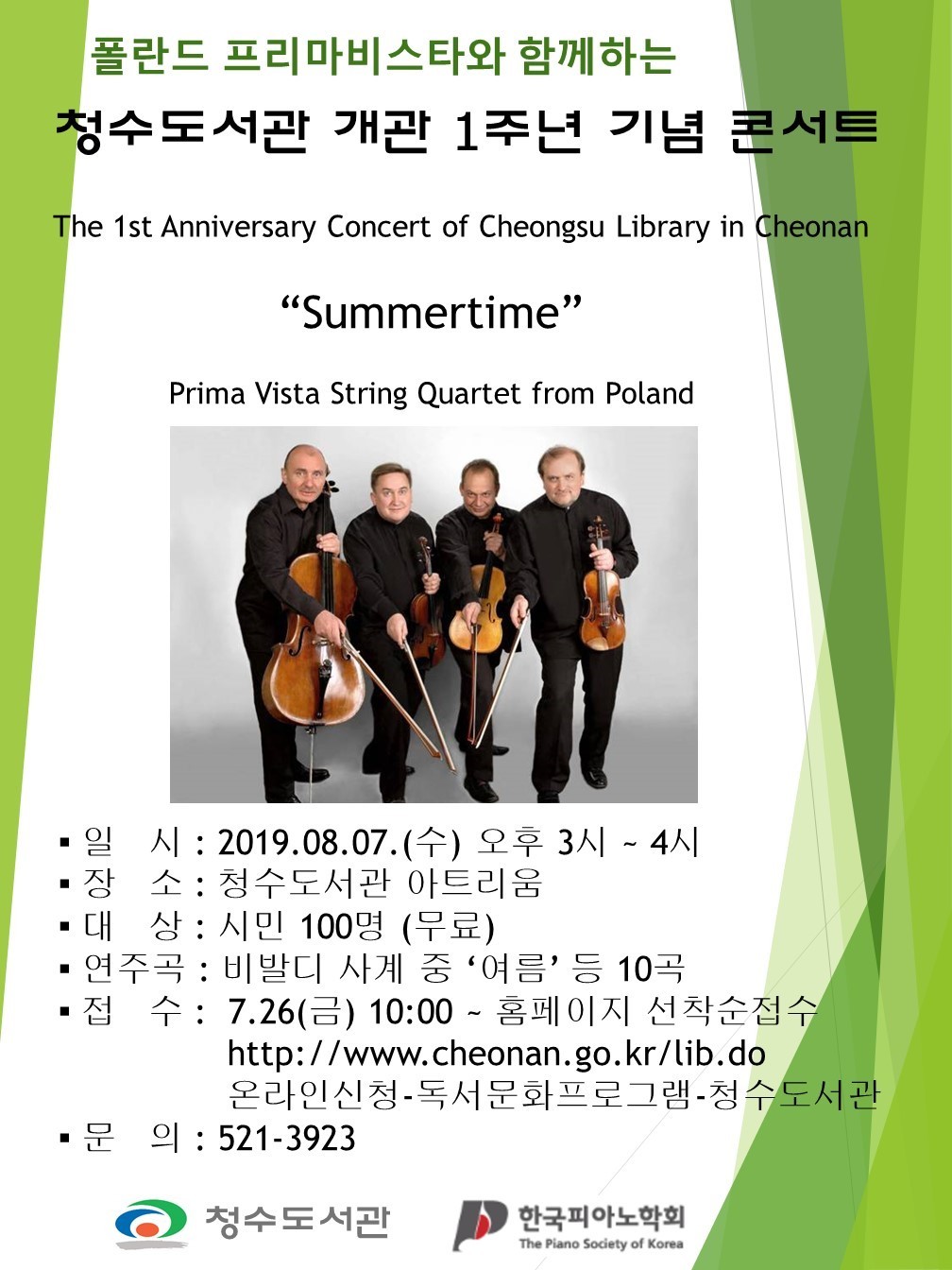 청수도서관 내 아트리움에서 진행되는 이번 공연은 ‘서머타임(Summertime)’을 주제로 열린다. 비발디의 사계 중 ‘여름’을 시작으로 ‘세레나데’, ‘야상곡’등 10곡을 선보여 무더운 여름, 도서관에 아름다운 선율을 전달할 예정이다.