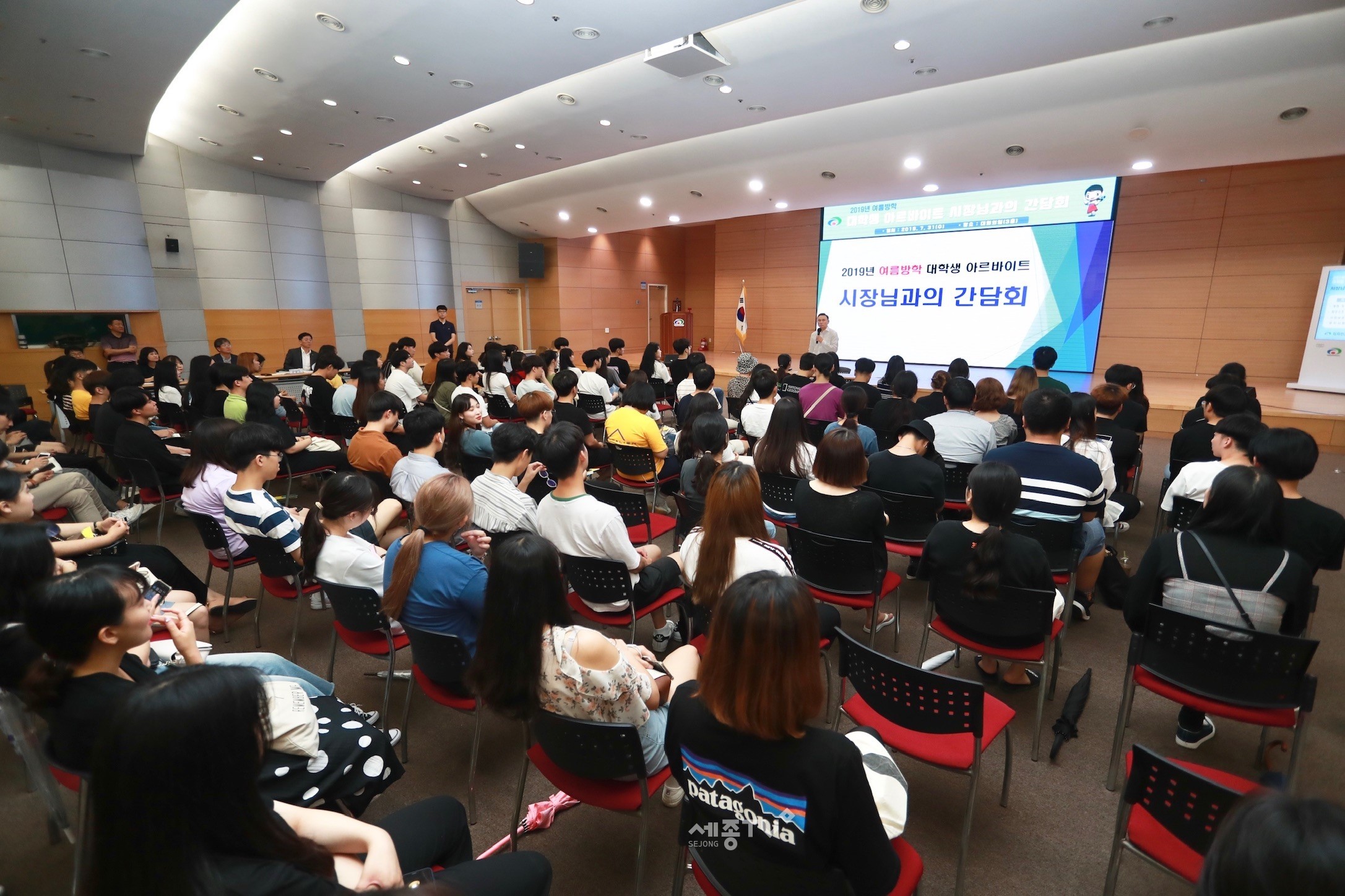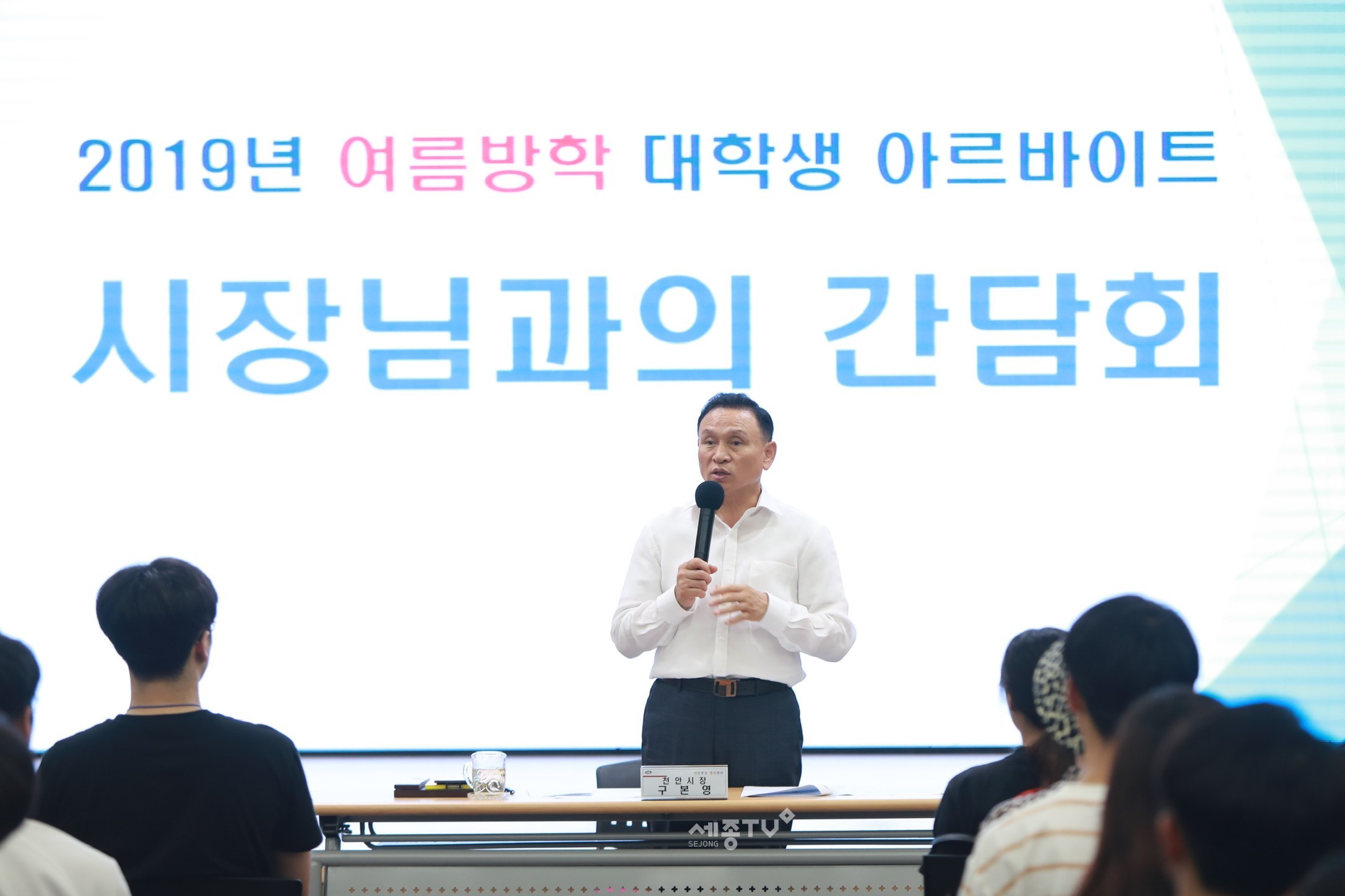 구본영 천안시장이 31일 시청 대회의실에서 2019 천안시 여름방학 아르바이트에 참여한 125명의 대학생들과 대화의 시간을 가졌다.