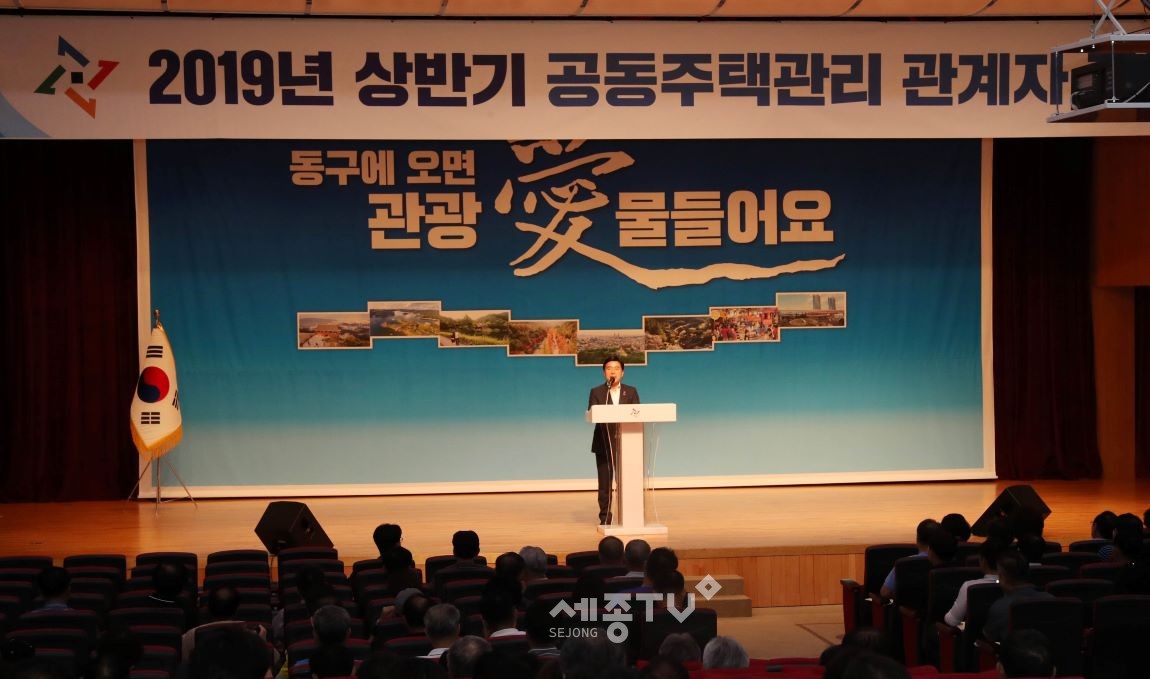 대전 동구(구청장 황인호)는 30일 구청 12층 공연장에서 의무관리대상 공동주택 65개 단지 동별 대표자 및 공동주택관리자 200여 명이 참석한 가운데 2019년 공동주택관리 관계자 교육을 실시했다고 밝혔다.