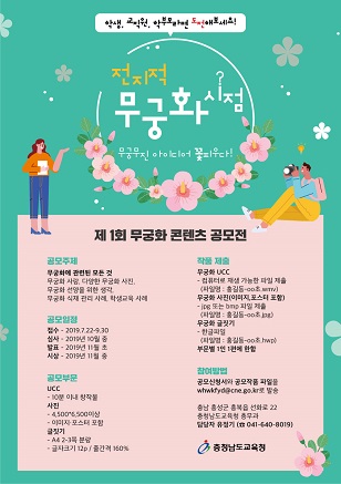 충남도교육청(교육감 김지철)은 나라사랑에 대한 관심을 제고하고자 ‘제1회 무궁화 콘텐츠 공모전’을 개최한다고 밝혔다.