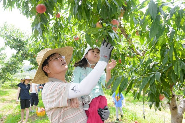 세종시 조치원 복숭아축제 둘째 날인 4일, 이춘희 시장이 어린이와 함께 복숭아 따기에 열중하고 있다.