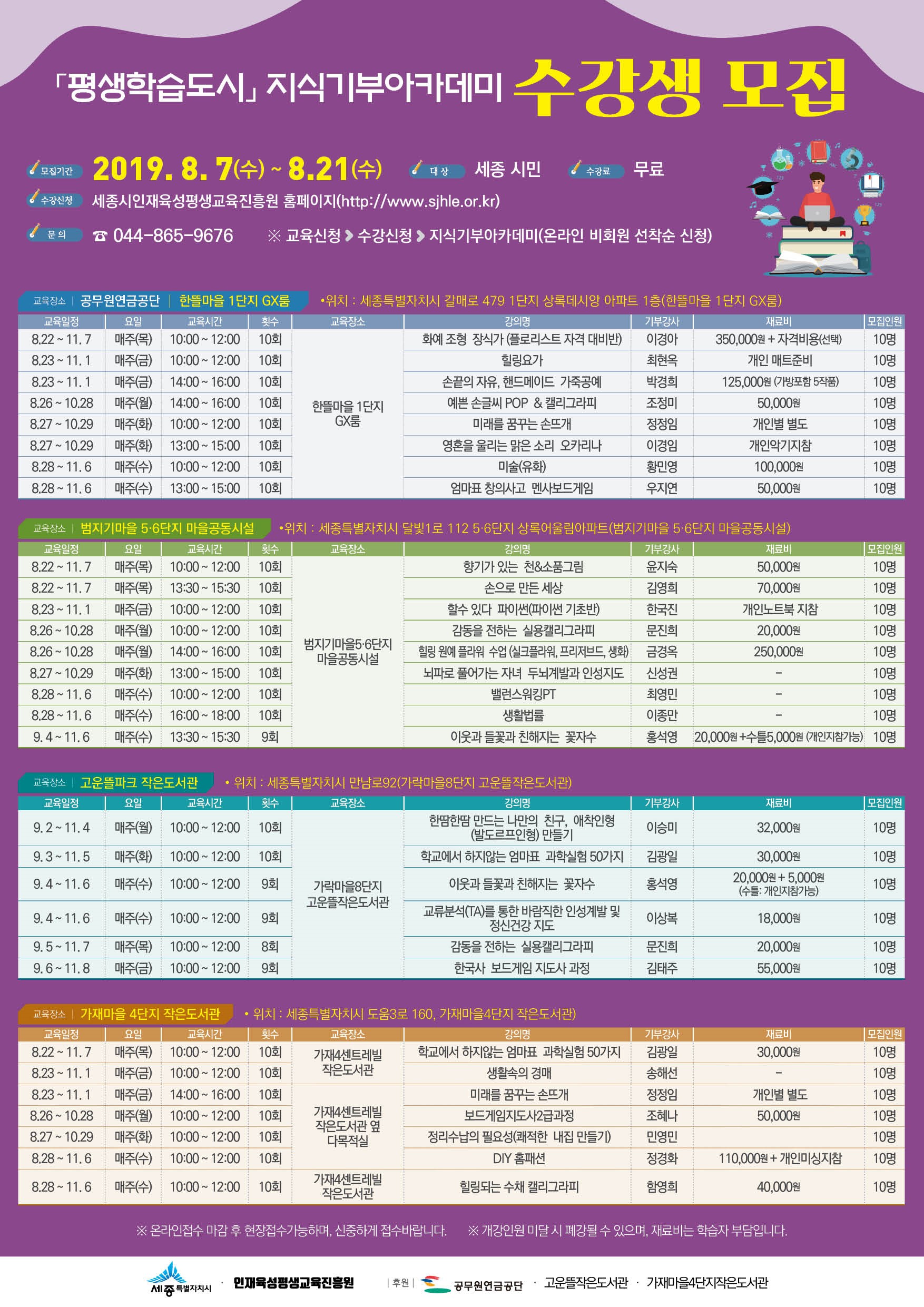 보다 자세한 사항은 시청 교육지원과(☎ 044-300-3922) 또는 세종시 인재육성평생교육진흥원(☎ 044-865-9676)로 문의하면 된다.