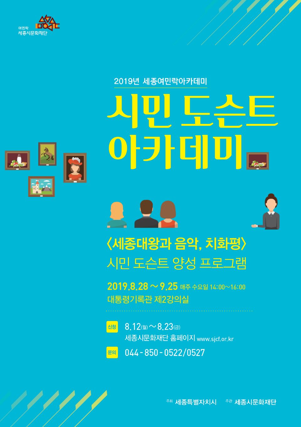 세종시문화재단(대표이사 인병택)은 세종여민락아카데미 시민 도슨트 양성 프로그램을 신설하고 8월 12일부터 수강생을 모집한다.