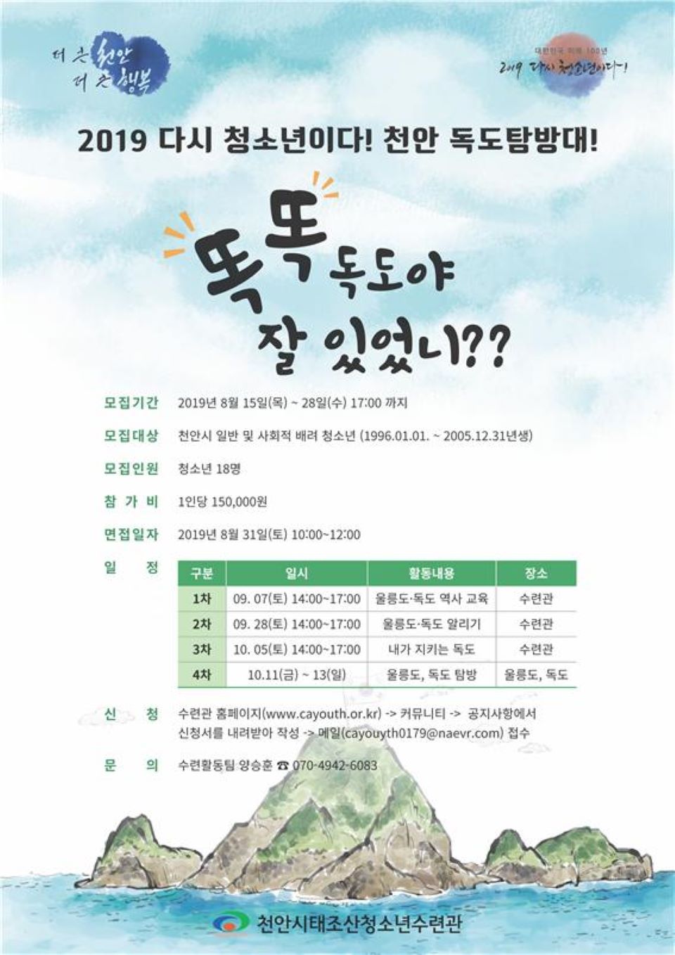 천안시태조산청소년수련관(관장 윤여숭)이 3․1운동 및 대한민국임시정부수립 100주년을 맞아 ‘2019 다시 청소년이다! 천안 독도탐방대!’에 참가할 청소년 18명을 모집한다.