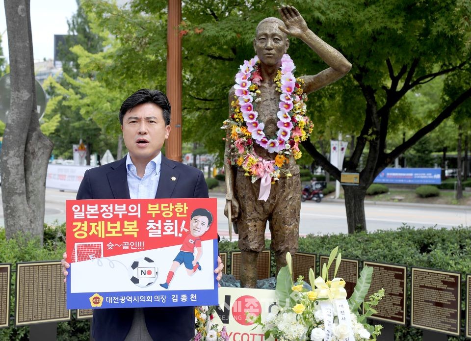 대전광역시의회 김종천 의장은 14일(수) 서구 보라매공원 강제징용노동자상 앞에서 ‘1일 1인 일본규탄 챌린지’릴레이에 동참했다.