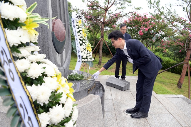 김정섭 공주시장은 제74주년 광복절인 15일 공주시 보훈공원 독립유공자기념비를 찾아 나라를 위해 희생한 순국선열의 숭고한 정신을 기리기 위해 분향 헌화했다.