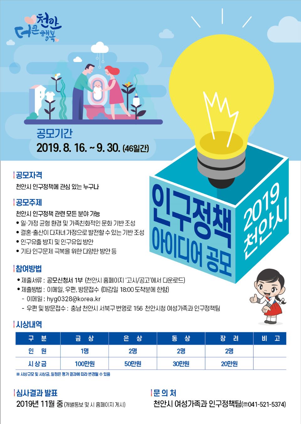 천안시는 16일부터 다음 달 30일까지 인구문제 극복을 위한 ‘2019 천안시 인구정책 아이디어’ 공모전을 개최한다고 밝혔다.