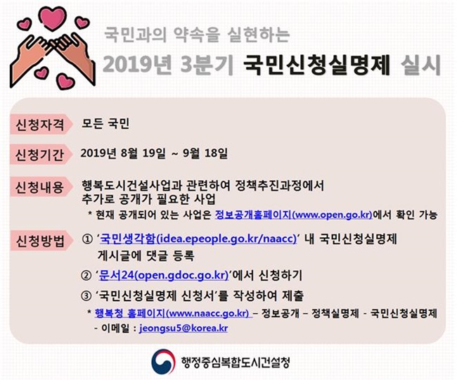 행정중심복합도시건설청(이하 행복청)은 2019년도 3분기 국민신청 정책실명제 대상사업을 8월 19일부터 9월 18일까지 신청 접수한다고 밝혔다.