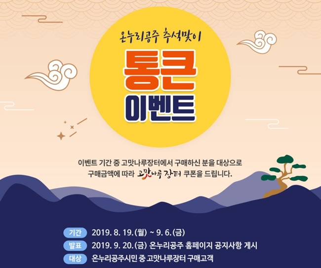 공주시의 대표 농‧특산물을 판매하는 인터넷 온라인 장터인 ‘고맛나루장터’에서 추석 명절맞이 특별 할인 이벤트가 9월 6일까지 진행된다.