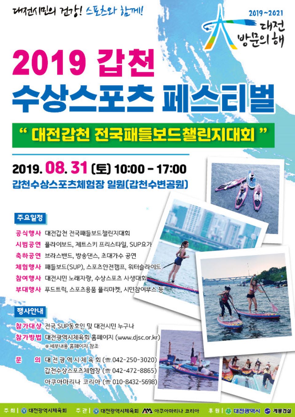 대전광역시체육회(회장 허태정)가 올여름 막바지 무더위를 날릴 ‘2019 갑천수상스포츠 페스티벌’을 개최한다. 오는 31일 갑천수상스포츠체험장 일원에서 개최되는 이번 페스티벌은 대전광역시와 (주)계룡건설의 후원을 통해 진행된다.